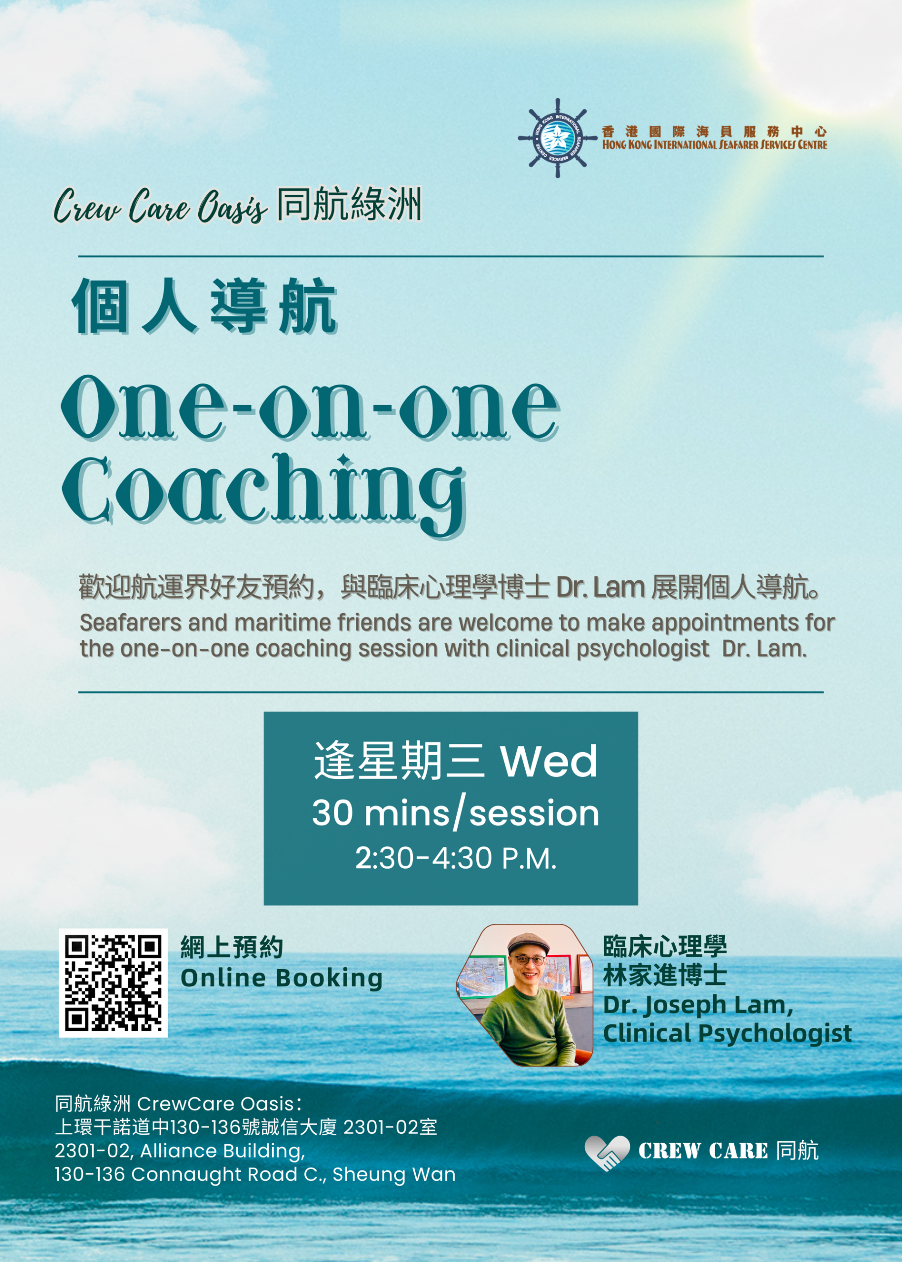 Seafarers and maritime friends are welcome to our one-on-one counselling service and talk with Dr. Lam, a clinical psychologist on Wednesday afternoon, 30 mins per session.