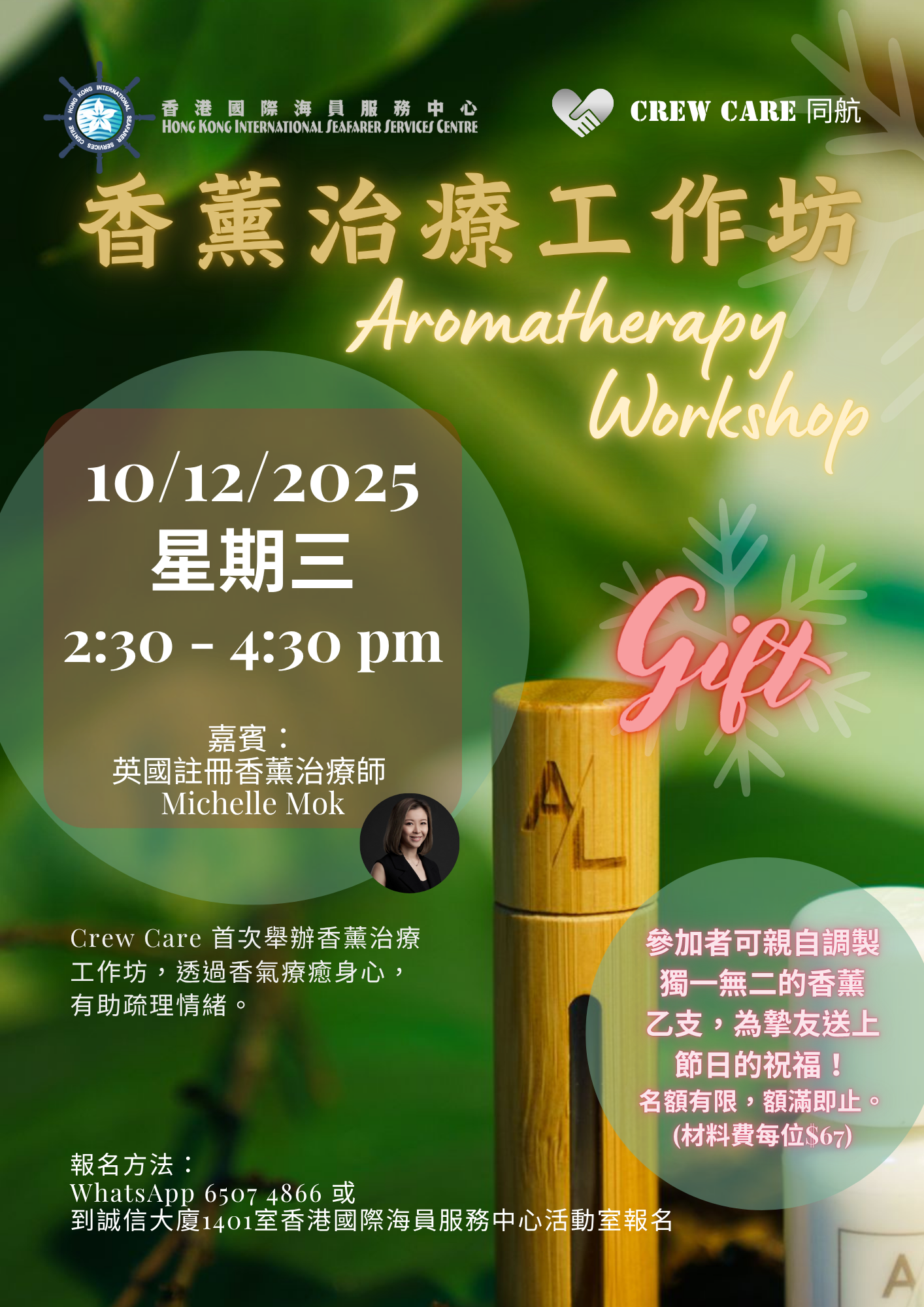 Crew CareDr. Lam將於12月10日下午2:30-4:30請來註冊香薰治療師 Michelle舉行「香薰治療工作坊」,參加者更可調製獨一無二的香薰乙支,送贈摯友!名額尚餘少量,額滿即止;材料費每位 $67。