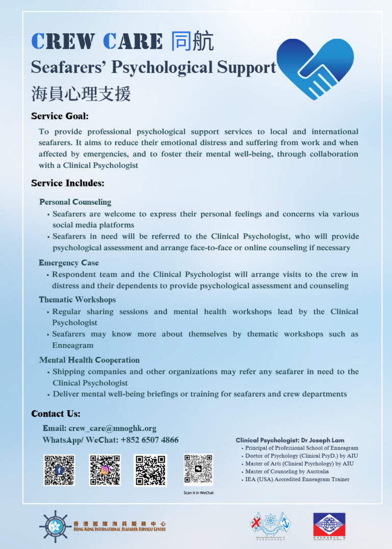 There is a growing recognition of the impact of mental health conditions on seafarers. The HKISSC, jointly established by MNOG and AUS, HK launched the Crew Care Seafarers’ Psychological Support in 2024. In 2025, Crew Care has expanded to introduce a dedicated special space, named “Crew Care Oasis” in Room 2301-02, Alliance Building. It is designed to host regular activities that help seafarers relieve stress and improve their psychological well-being.